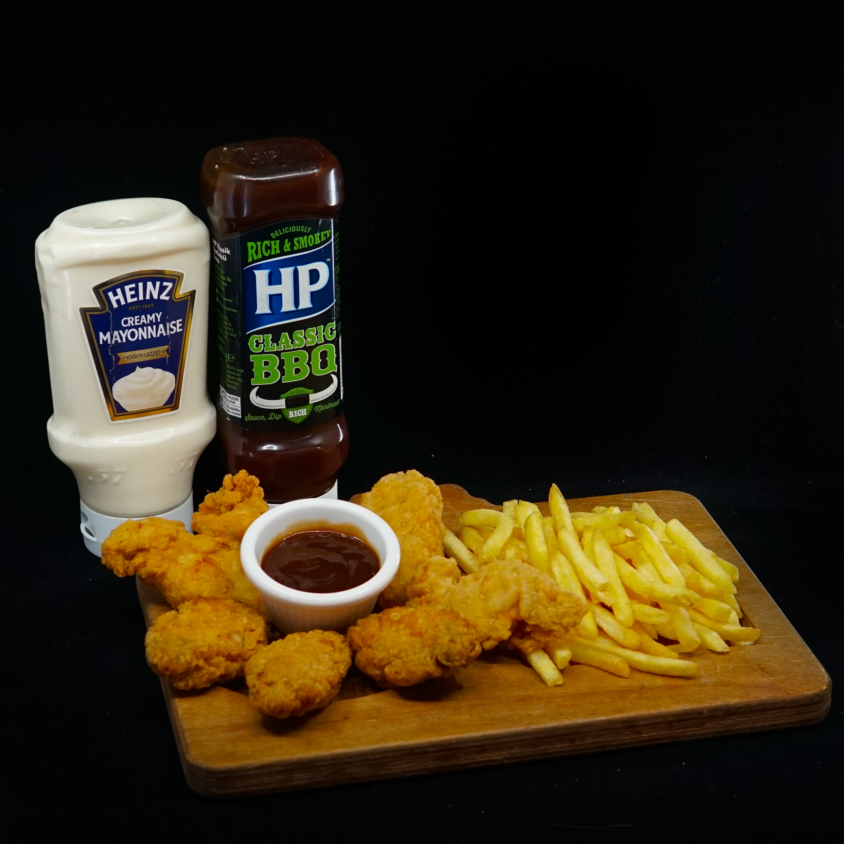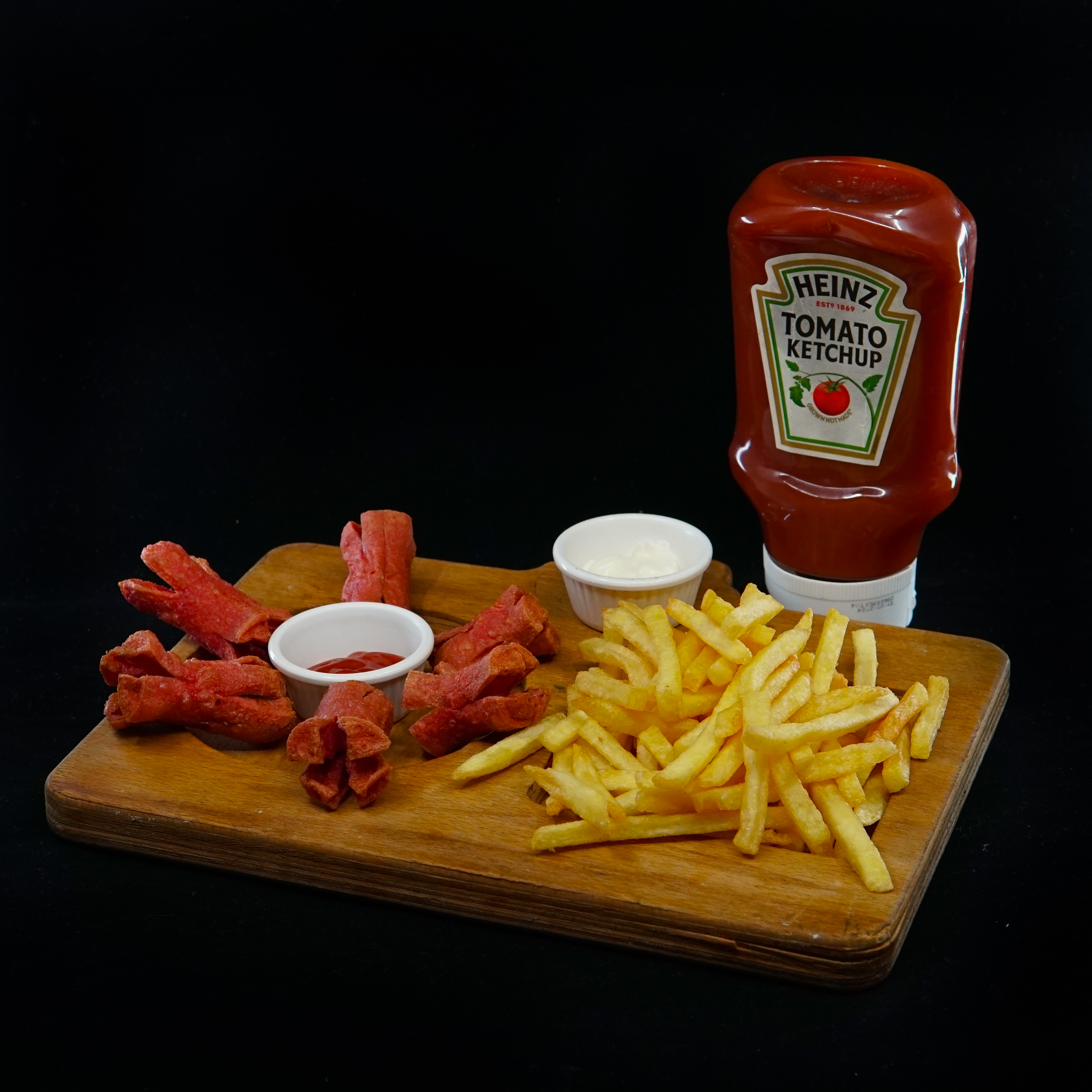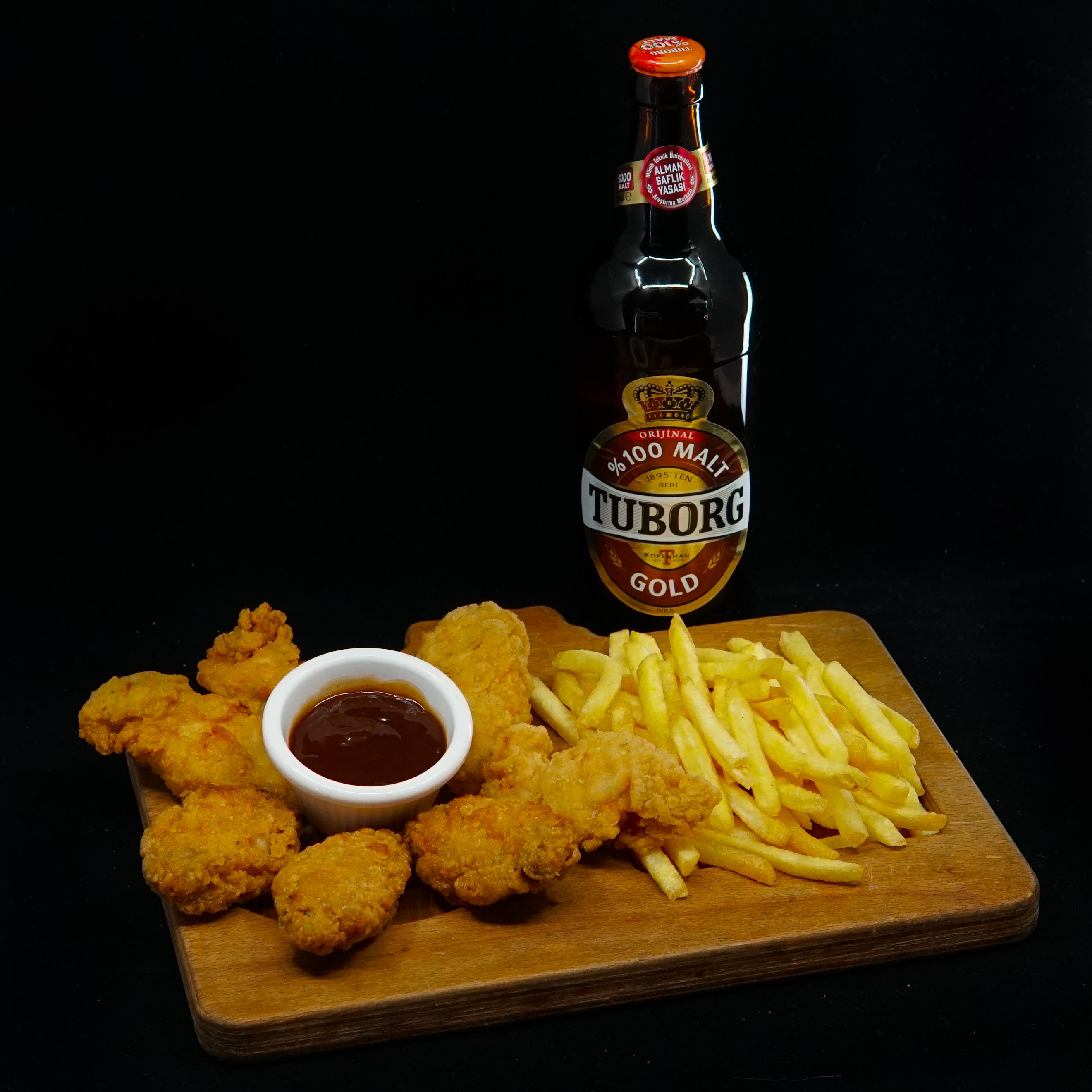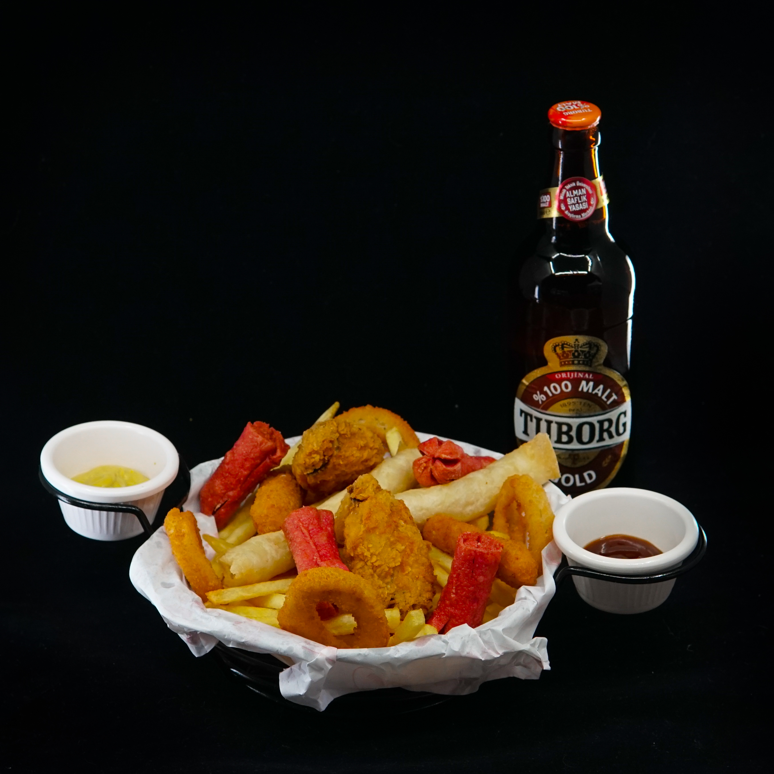 Parmak patates, soğan halkası, çıtır kanat, mozarella stick, sigara böreği ve sosis ile servis edilir.